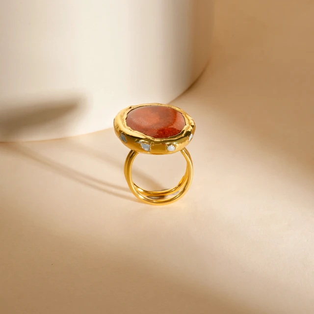 Oil Painting Style Natural Larimar and Red Coral Ring Luxury 24K Gold Plated Open Adjustable Ring for Unisex Women's Party
