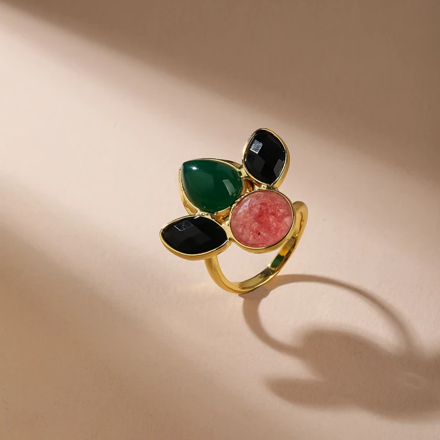 Fashion Vintage Strawberry Quartz Natural Gemstone Black Green Agate Adjustable Copper Gold Plated Ring Engagement Anniversary