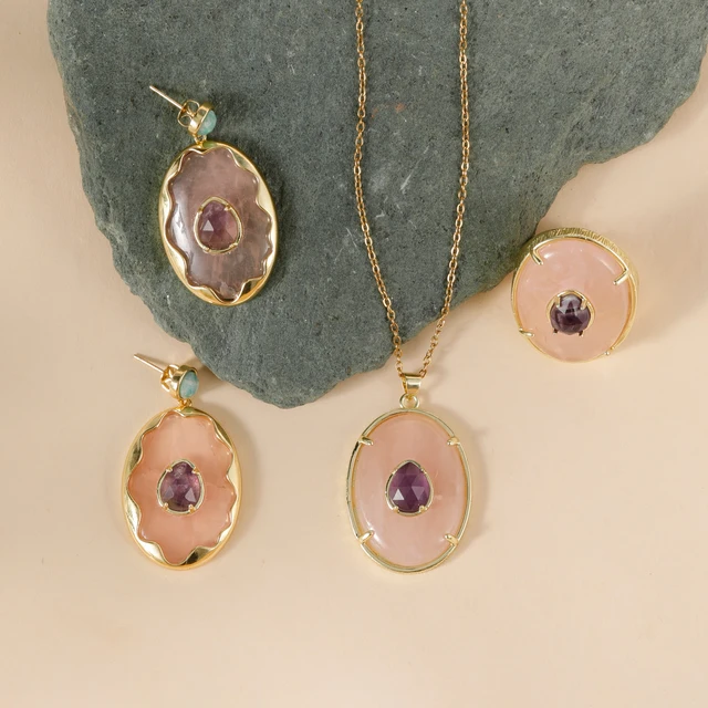 ชุดเครื่องประดับต่างหูสร้อยคออัญมณีควอตซ์ธรรมชาติทรงรีทันสมัยสำหรับงานเลี้ยงของผู้หญิงขายส่ง